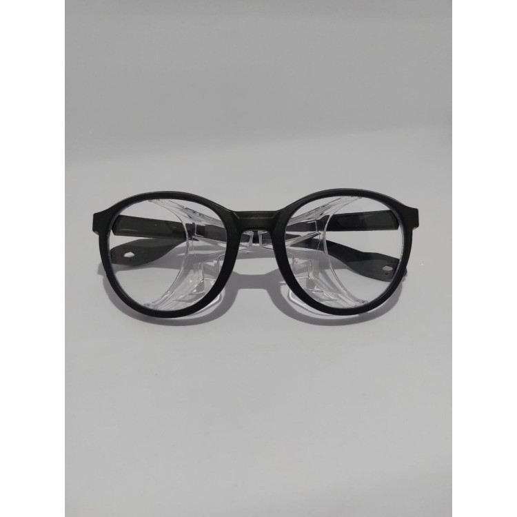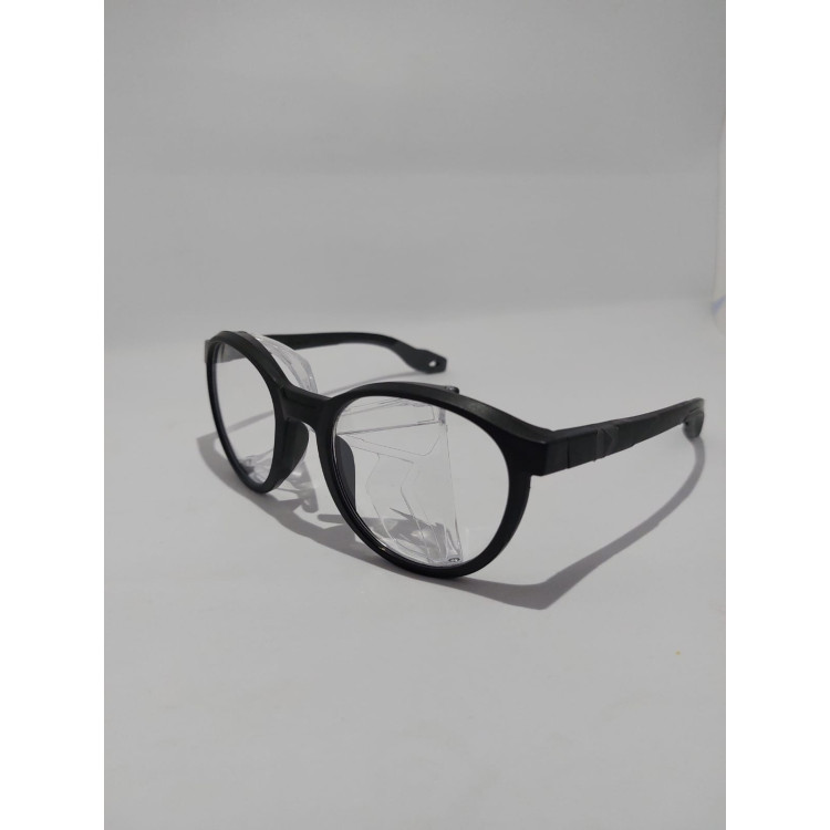 Óculos de segurança com armação modelo convencional confeccionada em poliéster com apoio nasal injetado na mesma peça, proteção lateral basculante confeccionada em poliéster incolor presa internamente à armação através de dois pinos, sendo um na parte superior e um na parte inferior da armação, hastes tipo espátula confeccionadas no mesmo material e cor da armação com borracha (para armação preta) presas à armação através de parafuso metálico.
